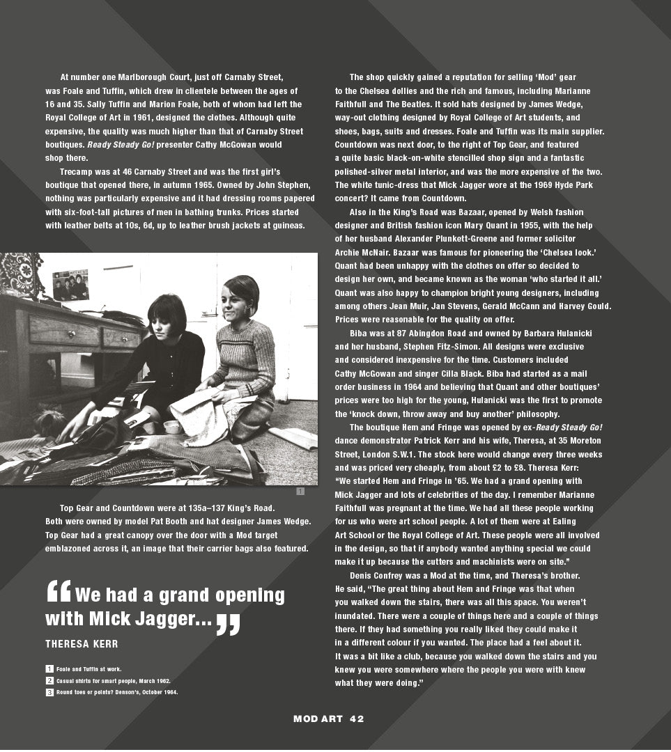 '... continues to shrine a light on a subculture that has seeped into all aspects of music, fashion, art and film over the past six decades.... brought to life thanks to a treasure trove of photographs, illustrations, reproduced concert flyers and adverts and famous and infamous record sleeves. Mod Art is a hugely enjoyable trip.' Classic Pop