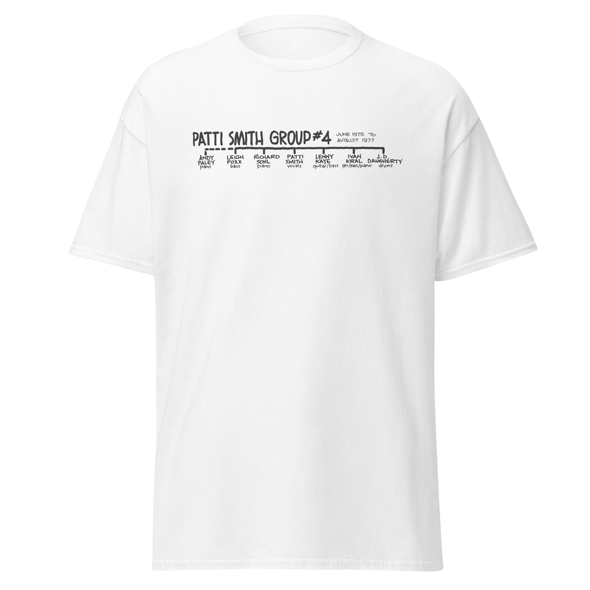 A Rock Family Tree T-Shirt for the fourth Patti Smith Group with Pete Frame’s original illustration, taken from the Rock Family Tree books.